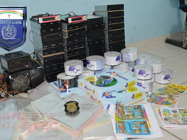 A polícia informou que também foram apreendidos 1,4 mil mídias virgens, quatro resmas de papel, três controladores de gravação, 39 gavetas de gravação e uma impressora. O material foi encaminhado para a 2ª Delegacia de Polícia Civil do município.